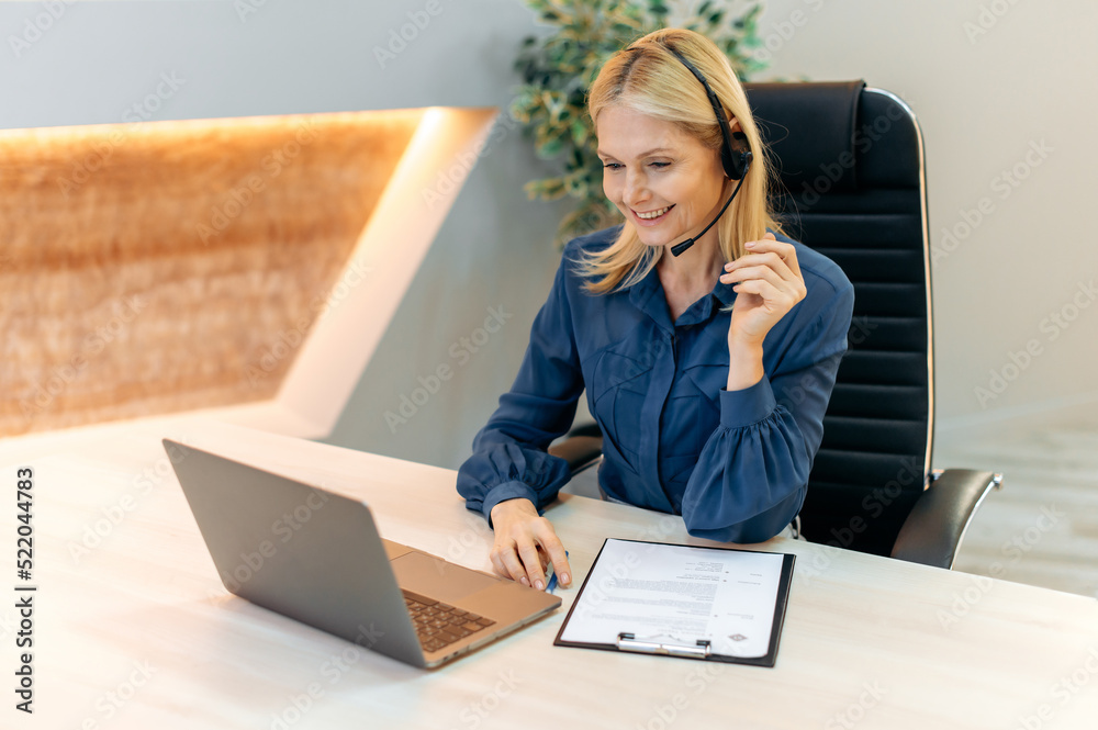 Successful elegant intelligent mature caucasian businesswoman, female financial advisor, in formal wear, with headset, sits in modern office, working in a laptop, holds online consultation, smiling