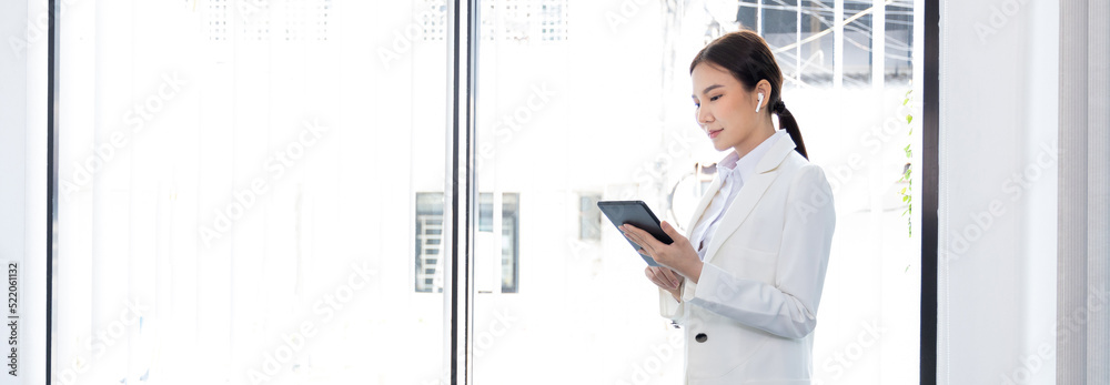 Business woman using a tablet to work in the office., World of technology and internet communication, Using tablet to conduct financial transactions because the convenience and speed..