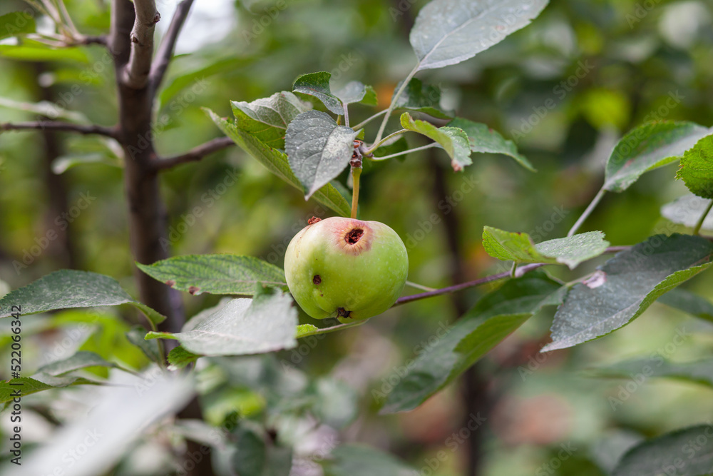 A green worm-eaten apple weighs on a tree branch in the garden. An apple affected by the disease, on a branch of an apple tree in the garden. A sick spoiled apple in close-up.
