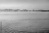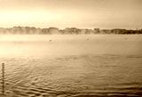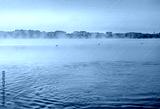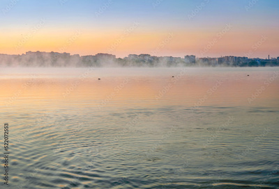 Sun rising above misty lake, the lake in the morning sunrise with fog on the water