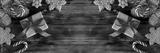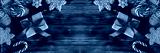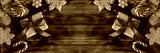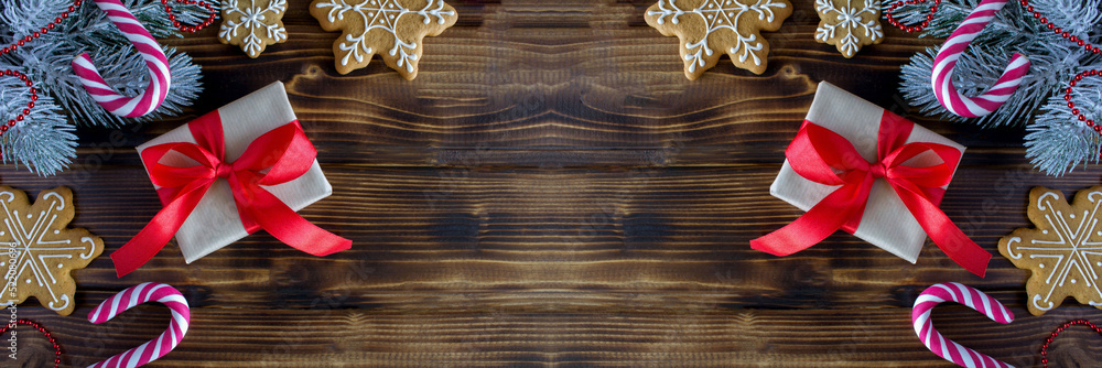 Christmas banner with gingerbread and gift box on the wooden background.Top view.Copy space.