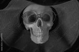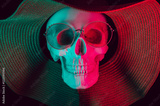 human skull wearing glasses and a hat with colored neon light on a dark background