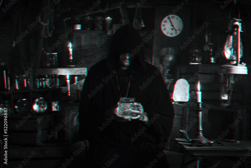 man in alchemist's costume in laboratory with jars by candlelight. Cosplay of computer game character with 3D glitch effect of virtual reality black and white