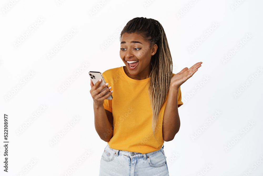 Image of happy black girl reacting surprised at phone notification, looking at smartphone and rejoicing, celebrating and smiling, standing over white background