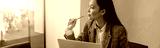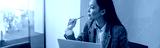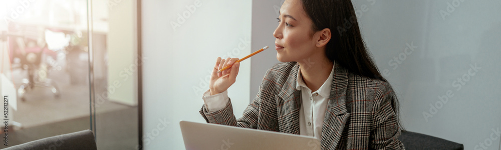 Thoughtful woman looking window while working on laptop in modern office. High quality photo