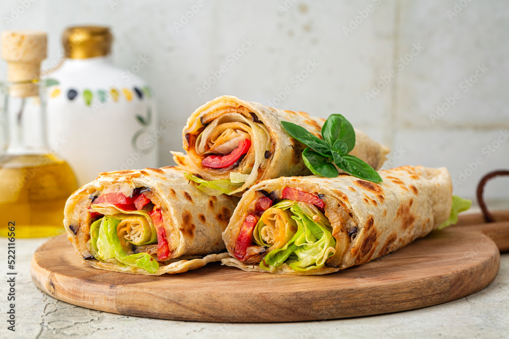 A wrap with a soft flatbread rolled around a filling with vegetables and cheese, tomato, fried eggplant, lettuce. Vegetarian food. Light background.