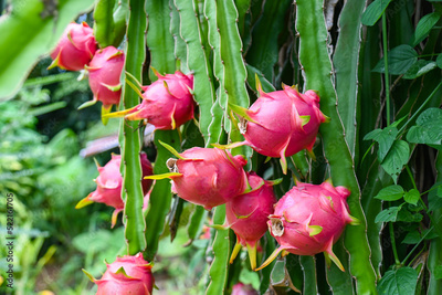 dragon fruit on the dragon fruit tree waiting for the harvest in the agriculture farm at asian, pitahaya plantation dragon fruit in thailand in the summer