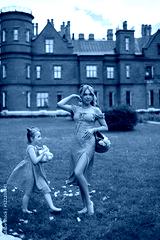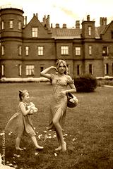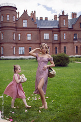 beautiful young mother with funny kid daughter holding a rabbit in his hands in pink dresses stand on a plaid in a green meadow in nature with a picnic in summer.