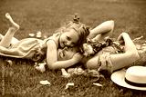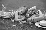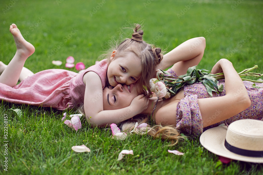 daughter the child hugs his mother, lying on a green meadow in summer. the family is lying in identical pink dresses.
