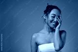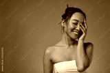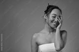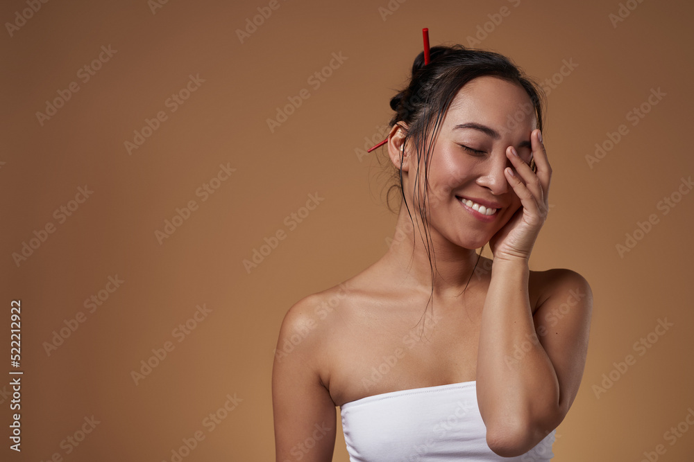 Smiling asian girl with closed eyes touching face