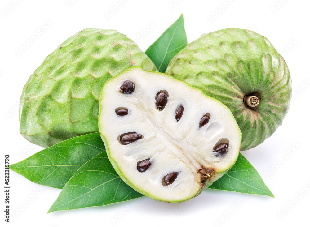 Custard apples or cherimoya fruits and slice of fruit isolated on white background.