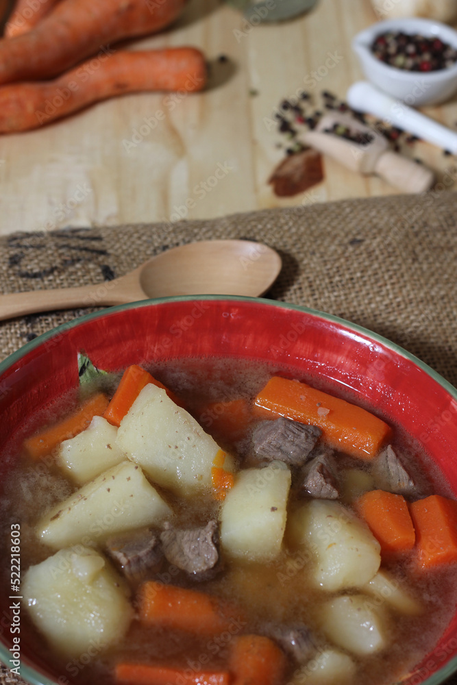 Hearty Beef Stew With Potato and and Carrots on Vintage Burlap potato Bag