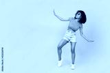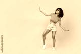 Full body portrait of excited positive girl dancing spend free time clubbing isolated on yellow color background