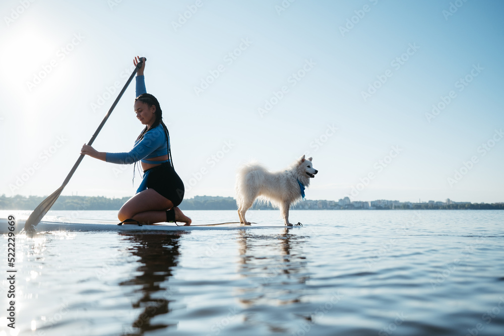 Woman Paddleboarding on the City Lake at Early Morning with Her Dog Japanese Spitz Sitting on the Sup Board