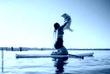 Woman Raising Up Her Dog Japanese Spitz While Sitting on the Sup Board on the Lake
