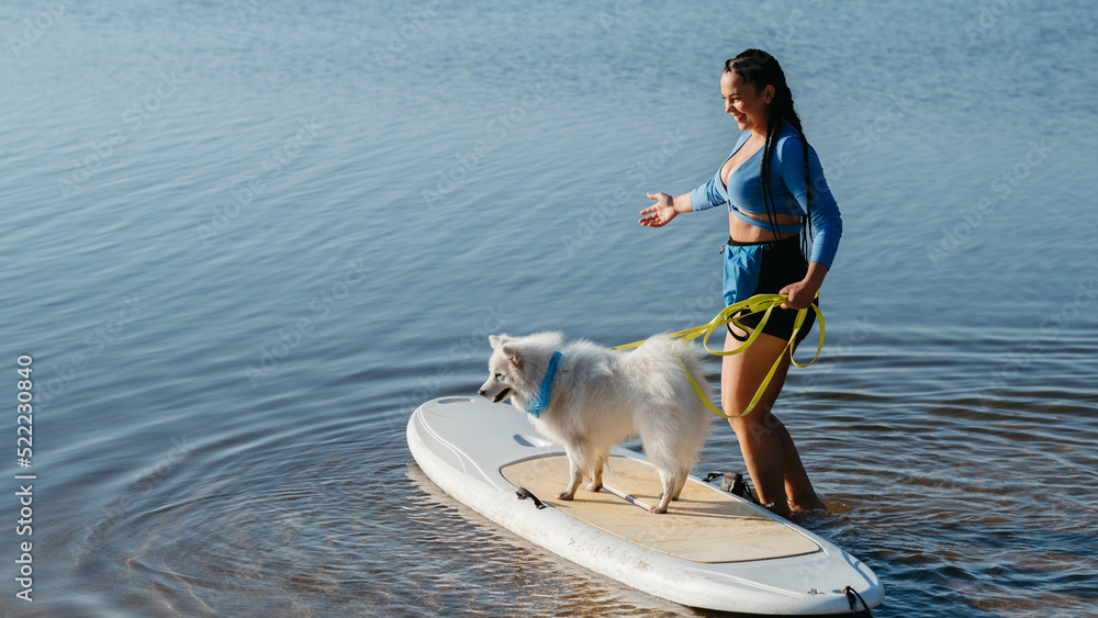 Woman Preparing to Paddleboarding with Her Dog Japanese Spitz Sitting on Sup Board on the Lake