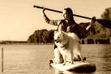 Snow-White Japanese Spitz Dog Standing on Sup Board, Woman Paddleboarding with Her Pet on the City Lake