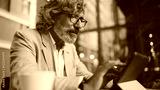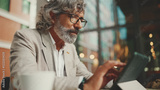 Mature businessman with beard in eyeglasses wearing gray jacket, working on tablet, sitting in an outdoor cafe. Successful man sitting at table in cafe in nature Mobile office freelancer
