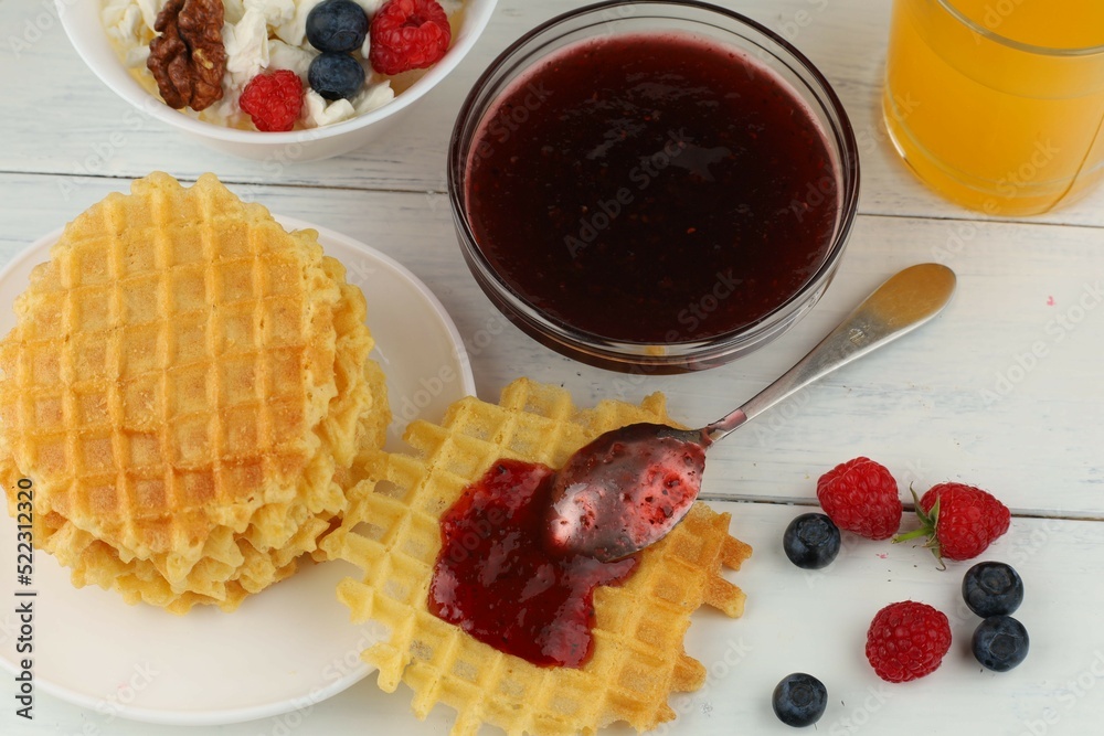 Belgian waffles with raspberry jam. Belgian waffles with berries