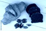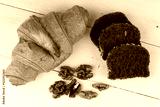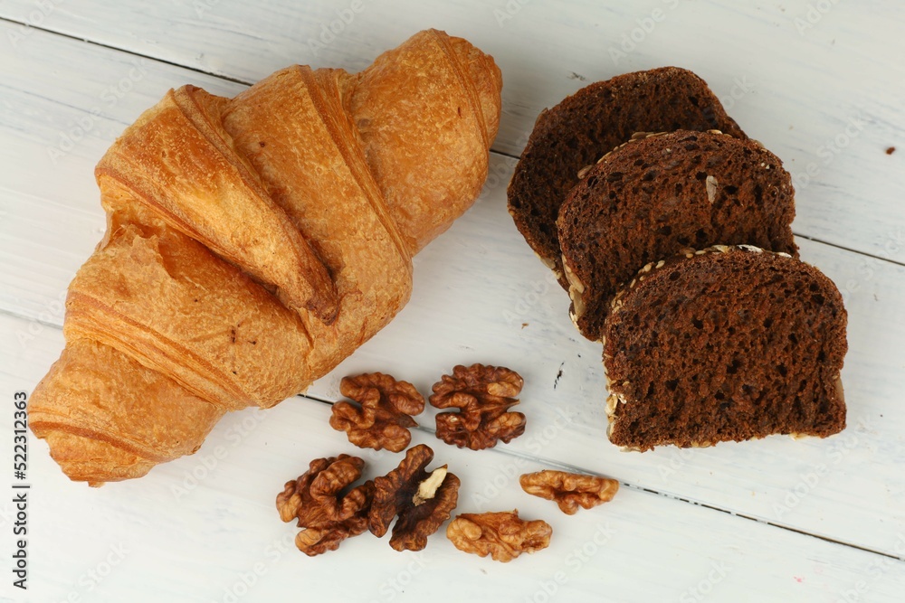 Croissant, bread and nuts. A source of protein, fat and carbohydrates. Vegetarian food