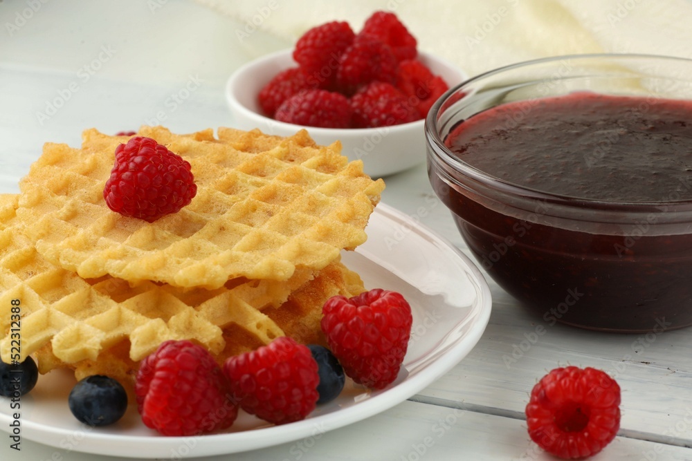 Belgian waffles with raspberry jam. Belgian waffles with berries