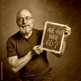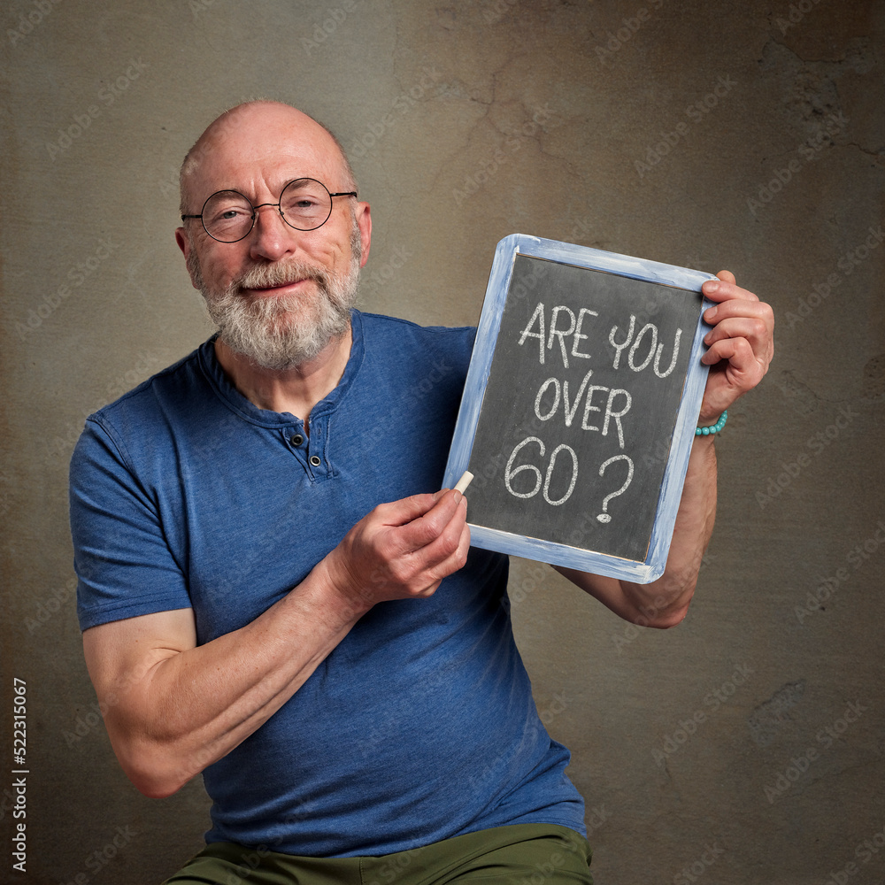 Are you over 60? A question in a white chalk on a slate blackboard held by a smiling senior male. A message directed to seniors..