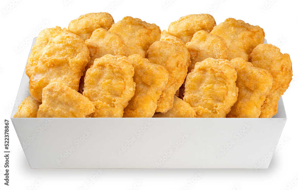 Fried nugget in paper bucket isolated on white background, Fried chicken nugget on white With clipping path.