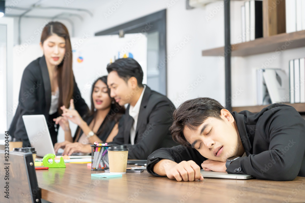 Businessman knock down on desk. overload working or deteriorating health or failure business down trend. Sleeping on the Desk at Work.