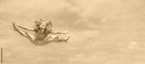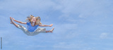 Happy kids. Young girl jumping up high to fly in the beautiful blue sky and white clouds. Childhood happiness. Summer holidays background.