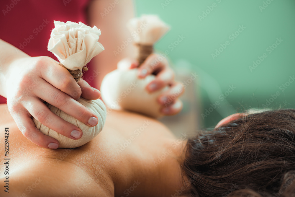 Kizhi massage or herbal bolus bags Ayurveda massage, hands of an Ayurveda Massage therapist pressing herbal bolus bags onto client’s skin