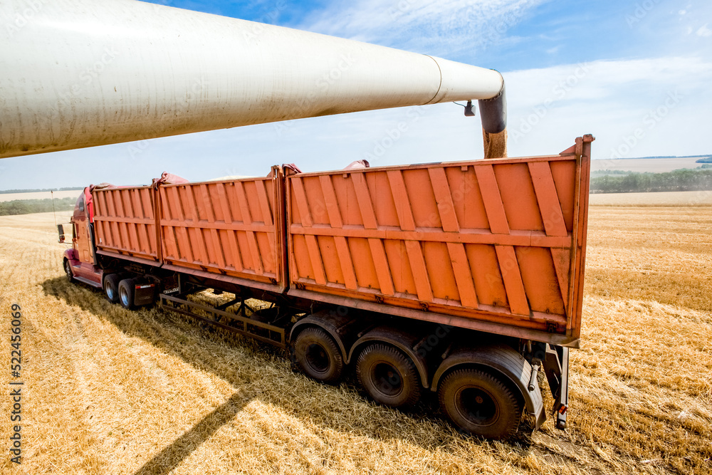 Grain harvesters working in wheat and rye field. Agriculture background. Harvest season