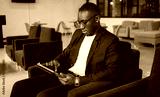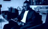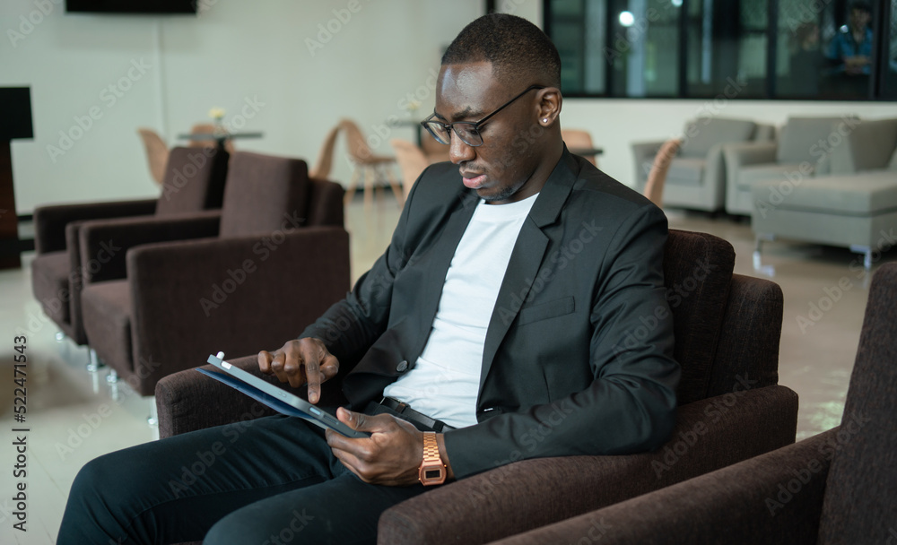 African man waiting for flight sitting in airport interior. waits for plane and sits at lounge zone.