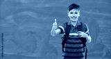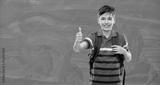 education, school and people concept - smiling student boy with backpack showing thumbs up over green chalkboard background