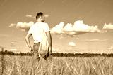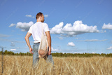 A young man stands on a sunny day in a rye field. A man holds an ecological shopping bag, a shopping bag with bread