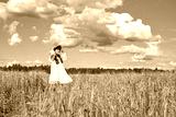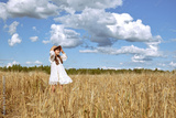 A little girl in a white dress and a straw hat plays with a toy plane in a rye field in