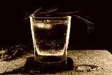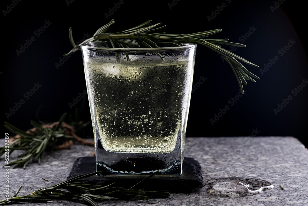 A highly carbonated drink with ice and a sprig of rosemary on a dark background.