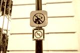 Banning bicycling sign and walking dogs yellow nameplate in a city park, public place. No biking, no walks with dog. Road traffic sign. Forbidden signs with rules of conduct outdoors on a city street.