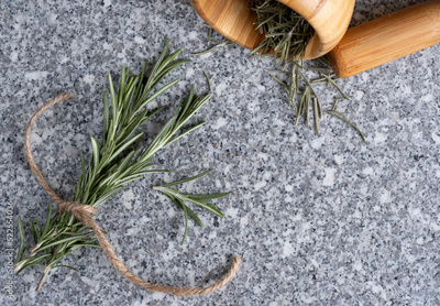 Dry rosemary in a wooden mortar and fresh rosemary branches on a granite stone. Culinary background with free space for your text.