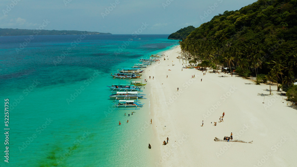 Sandy tropical beach with tourists and blue clear sea. Summer and travel vacation concept. Boracay, Philippines. Seascape with beach on tropical island. Puka shell beach