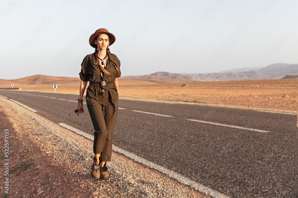 A beautiful girl in a hat is walking near the road in the desert. Morocco