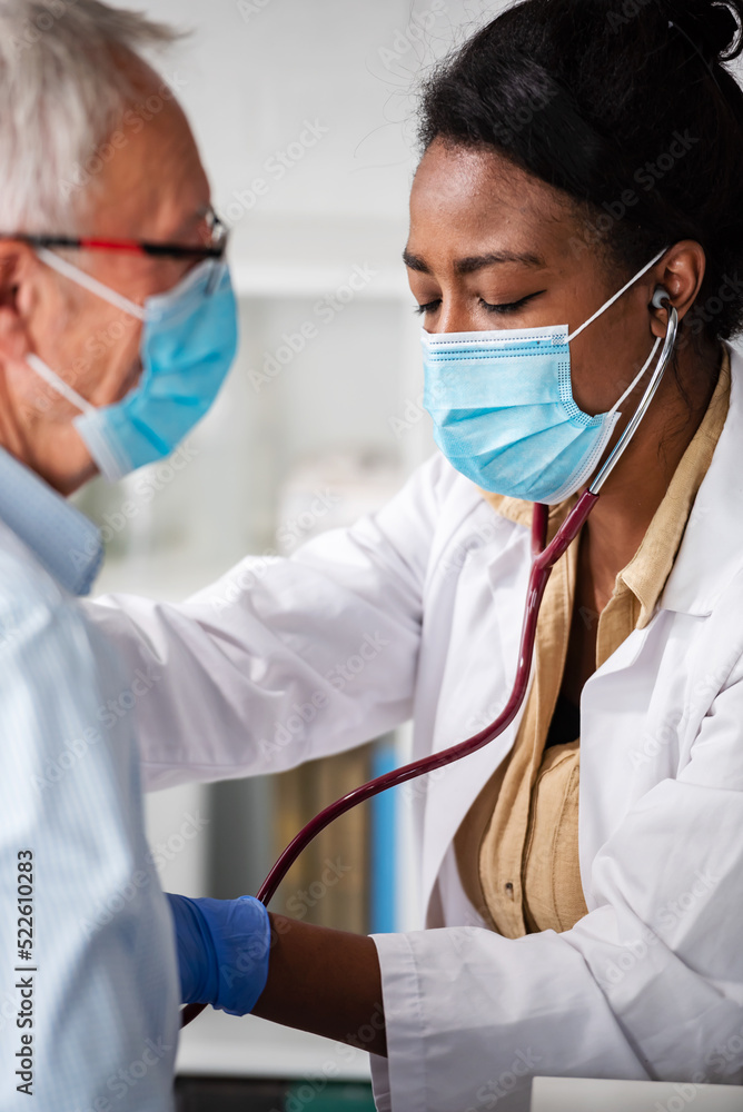 Female doctor is examining male elderly patient at clinic. Doctor and patient wearing a face mask.