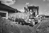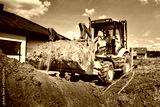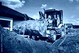 Excavator working at house construction site - digging foundations for modern house. Beginning of house building. Earth moving and foundation preparation.