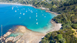 Aerial View from Ocean, Beach, Green Trees and Mountains in Waiheke Island, New Zealand - Auckland Area
