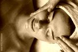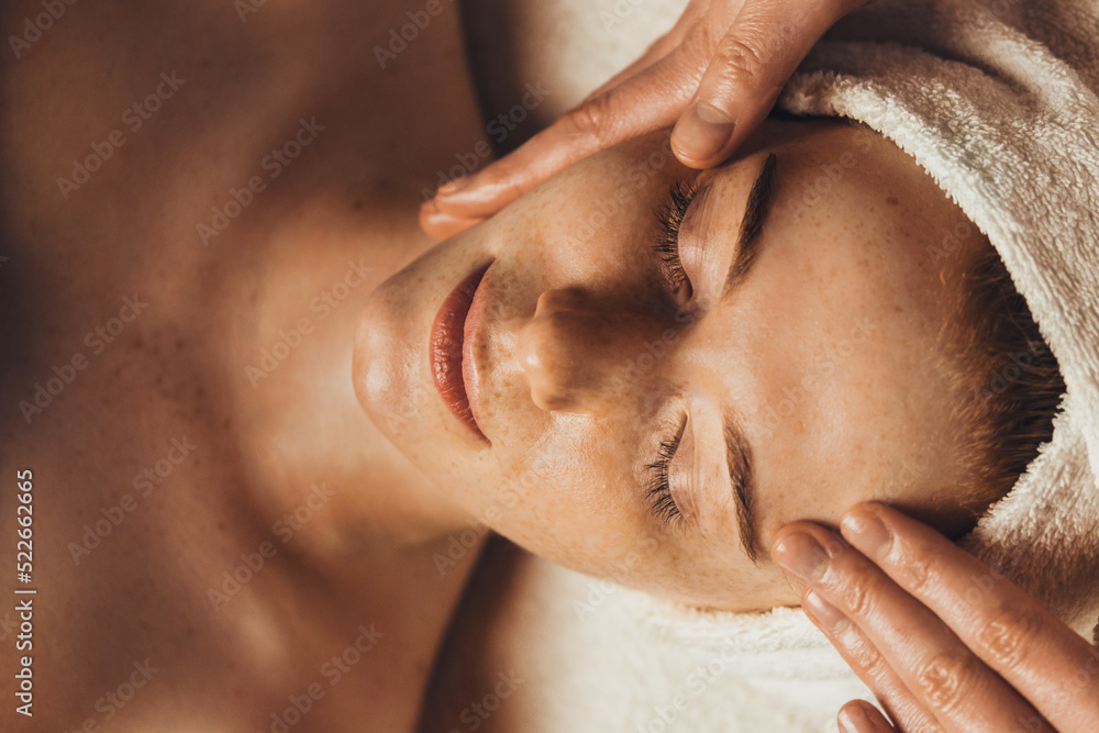 Caucasian freckled woman having a facial massage beauty treatment. Natural woman beauty, skincare. Beauty treatment. Beauty portrait. Healthy lifestyle.