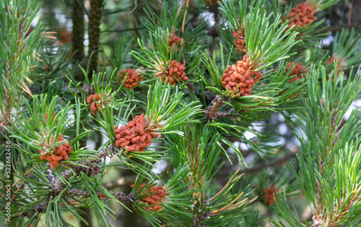 Green natural background with close-up of a blossoming pine branch in the forest on a sunny day