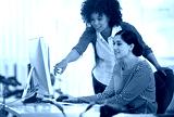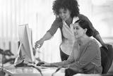 Teaching, training and showing a new employee or intern how business is done as a manager, boss or supervisor. Human resources executive working with a potential hire on a computer in the office