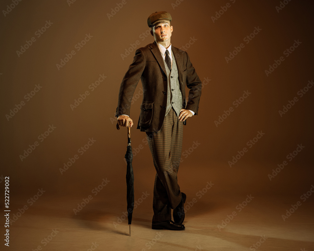 Retro style portrait of young man in image of english gangster, businessman wearing suit and cap standing isolated over dark vintage background.