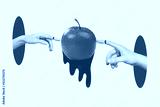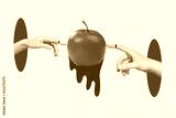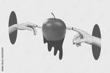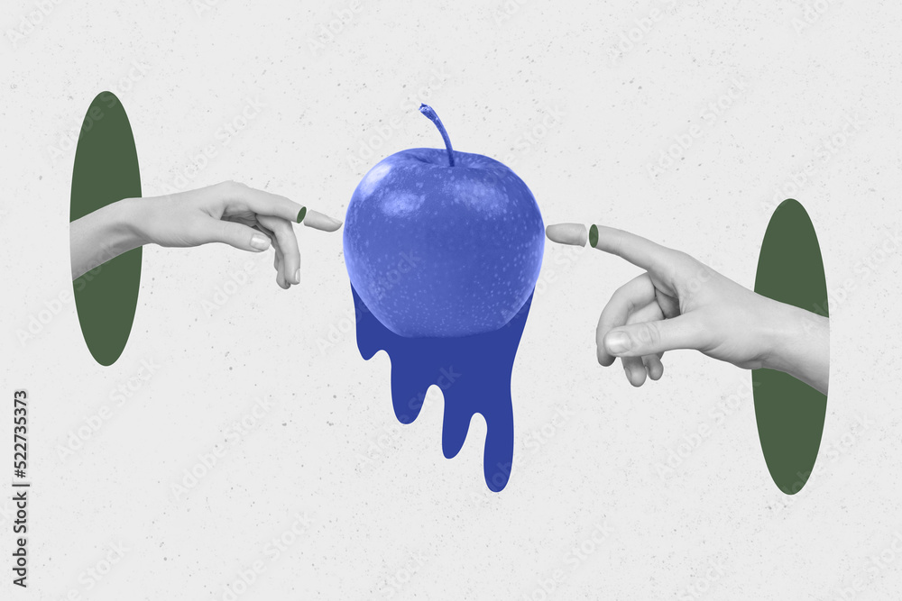 Composite collage picture of two human hands black white gamma point touch finger drawing apple isolated on creative background