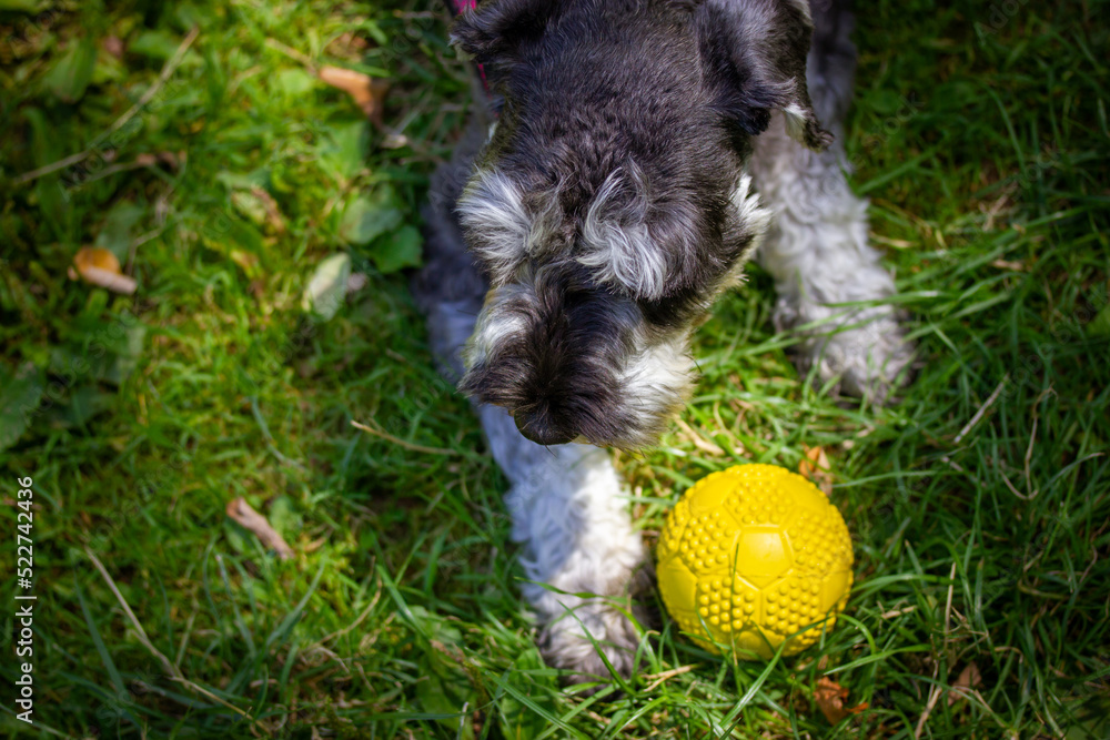 Grey miniature zwergschnauzer puppy is lying on a green grass on a lawn on nature and playing with a yellow ball. Cute funny doggy on a walk. Canine domestic animal, pet in green park, woods, forest.