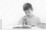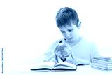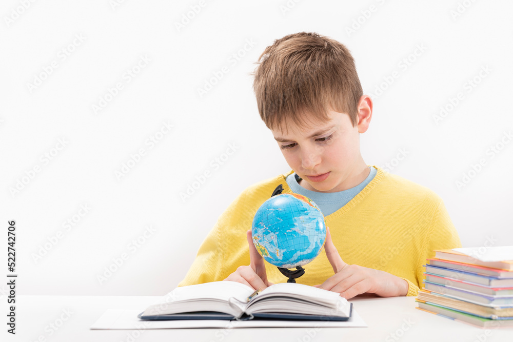 Boy in yellow jumper does geography lessons. Schoolboy sits at table and carefully studies the globe.